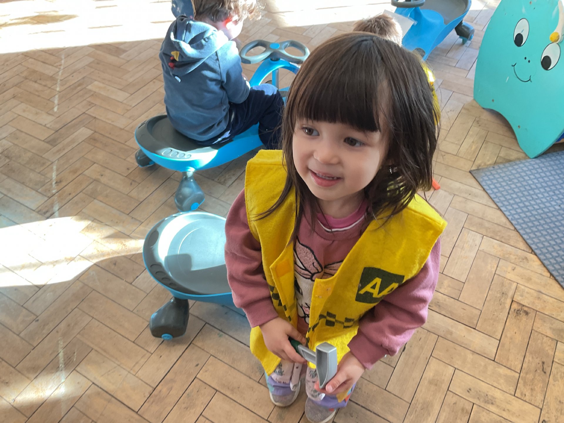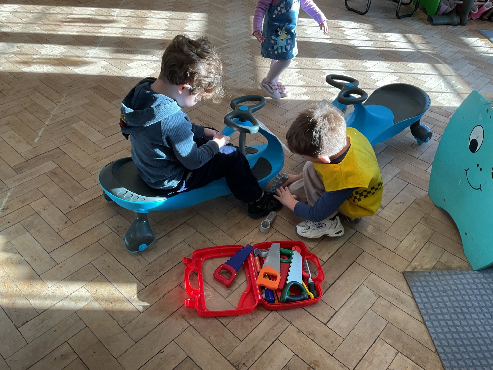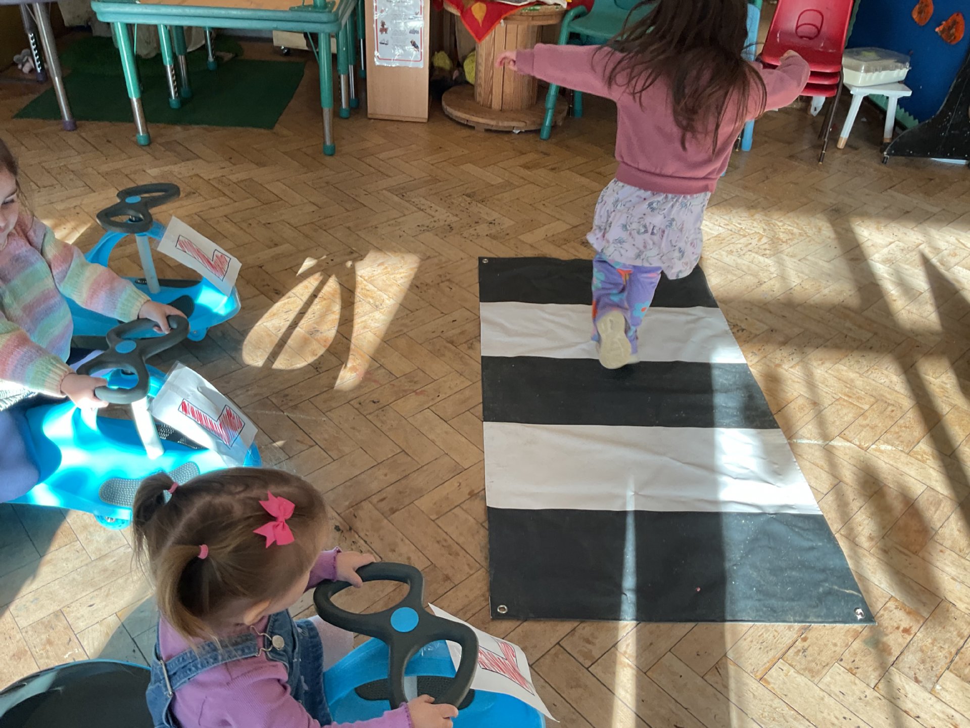 We took part in learning about road safety. We learnt all about colours on a traffic light and zero crossings using the wiggle bikes to help us in our role play.