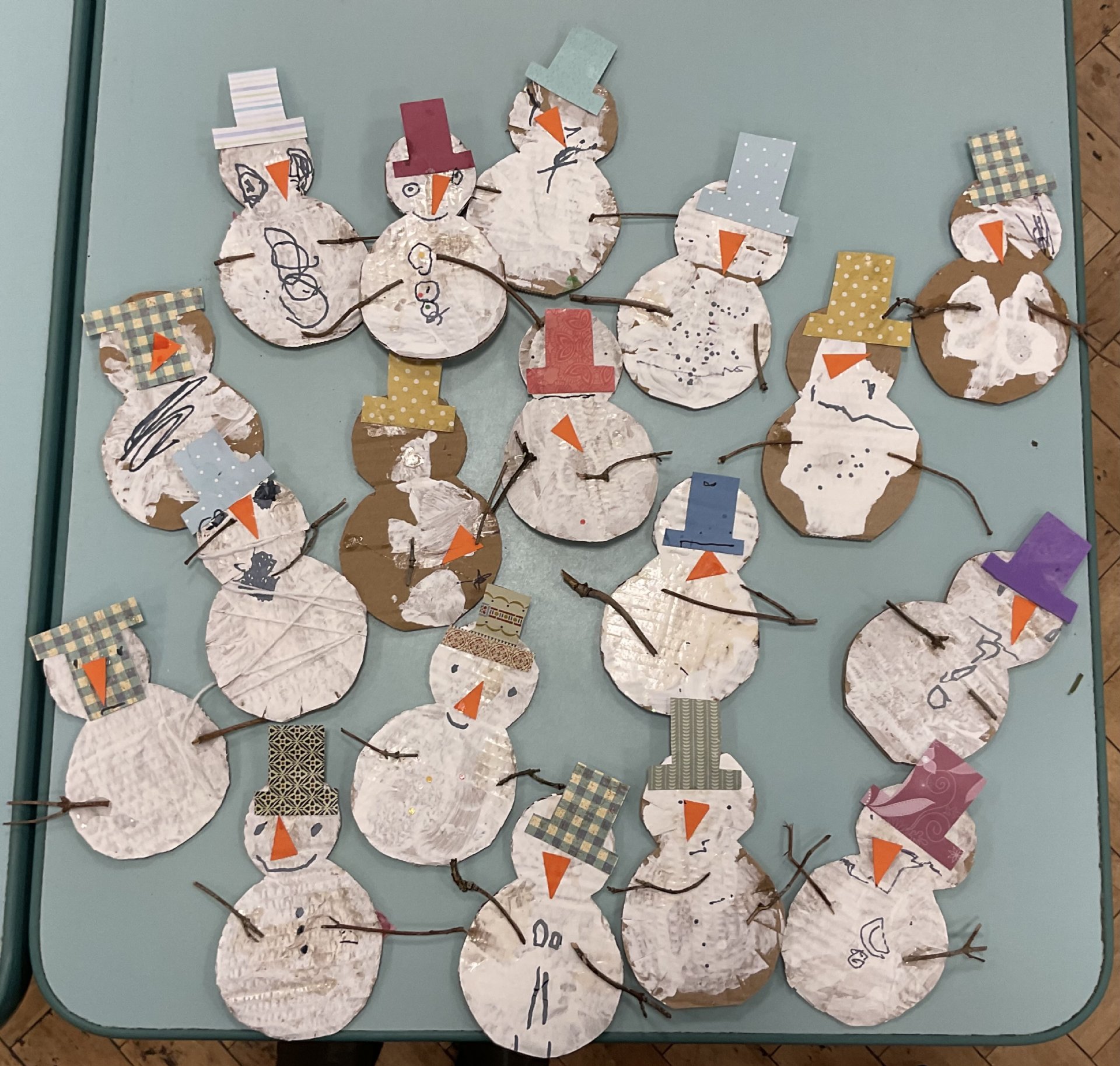 Everyone made a snowman and used ties and different shapes to decorate them.