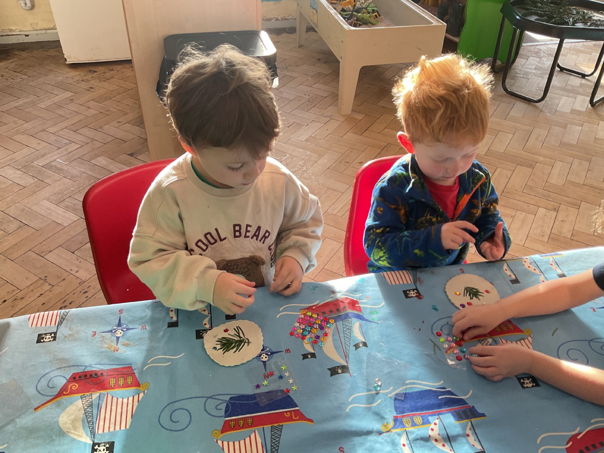 Using offcuts from the class tree, we made clay decorations, adding gems to make them sparkle.