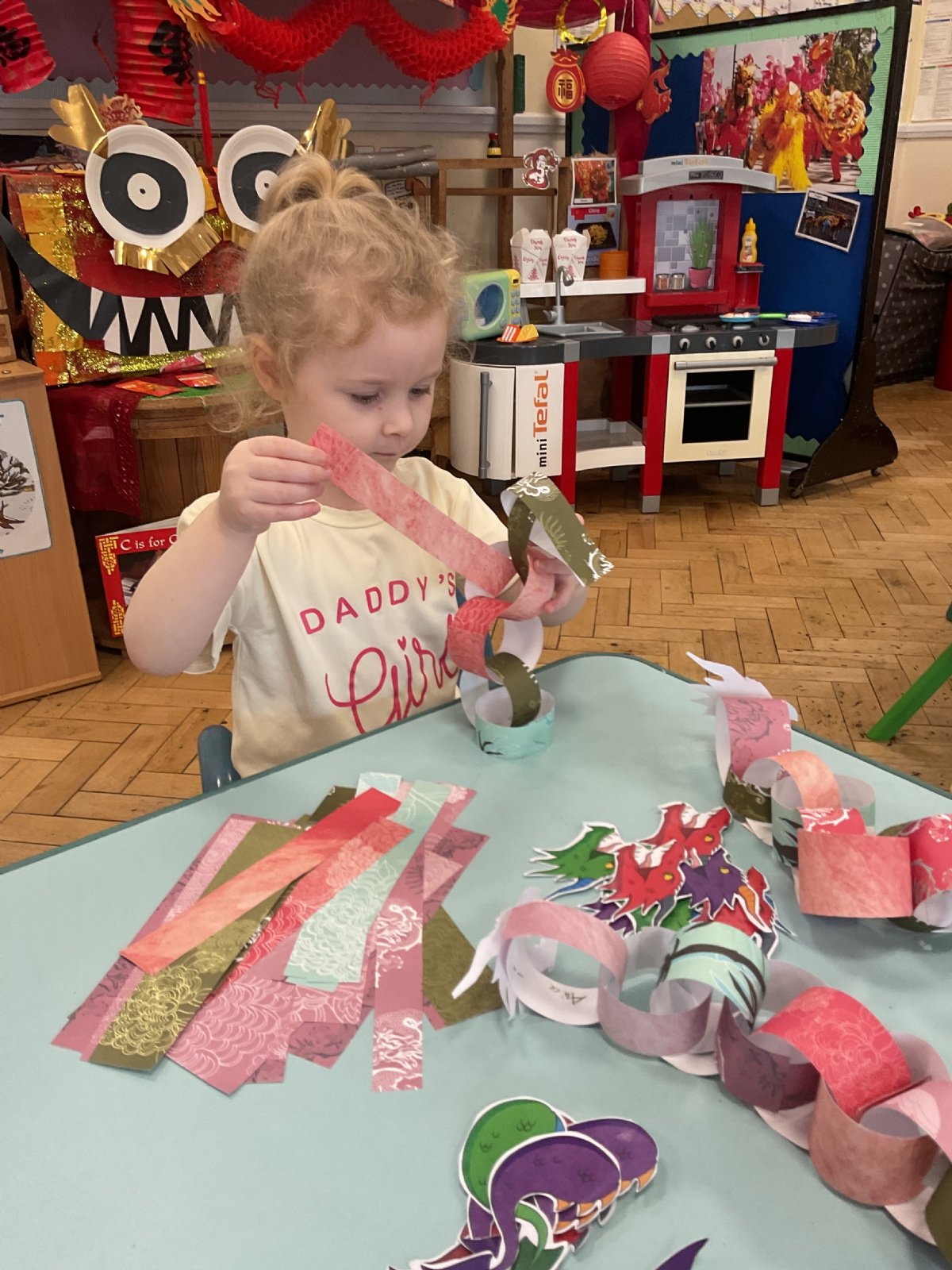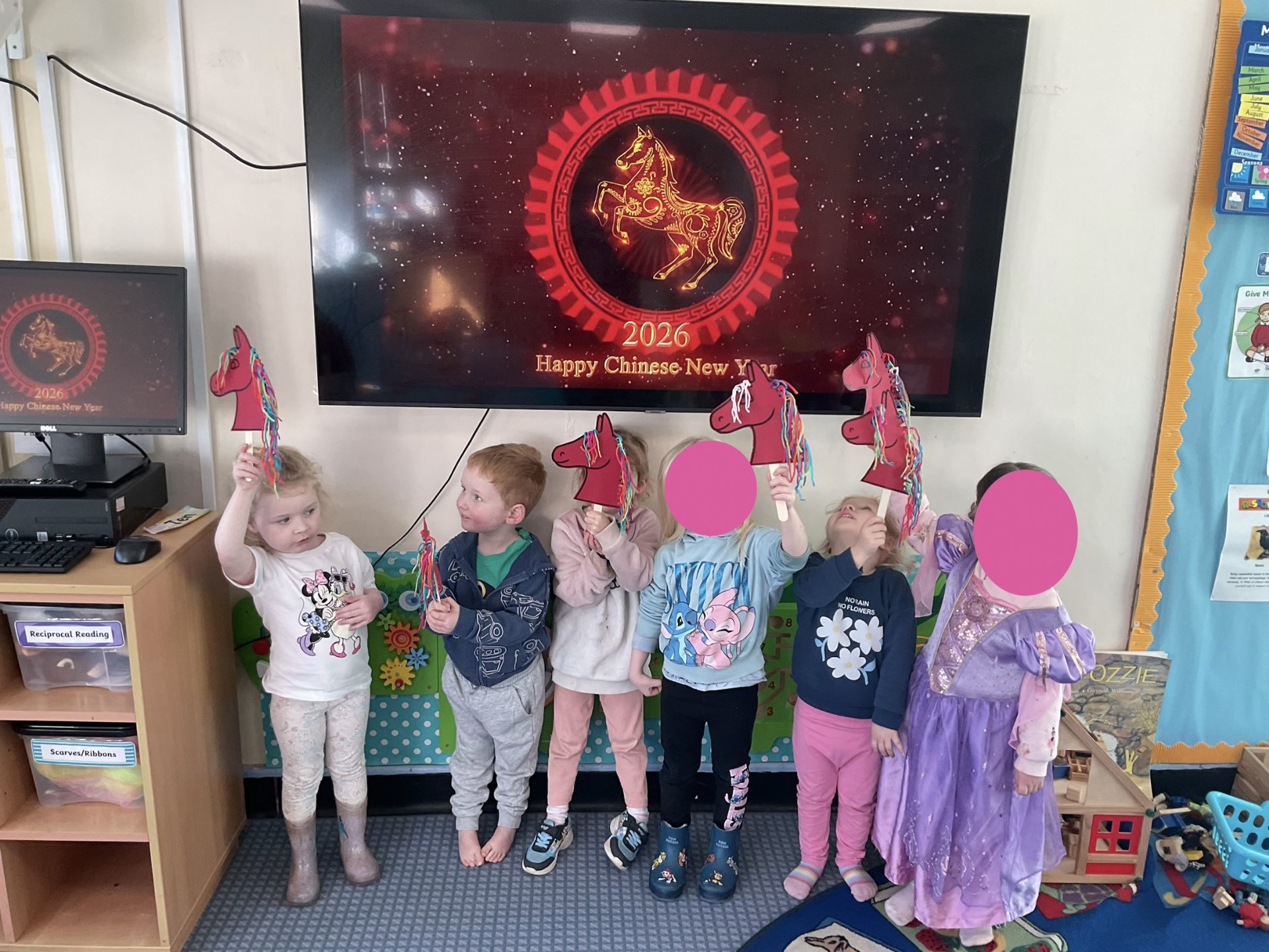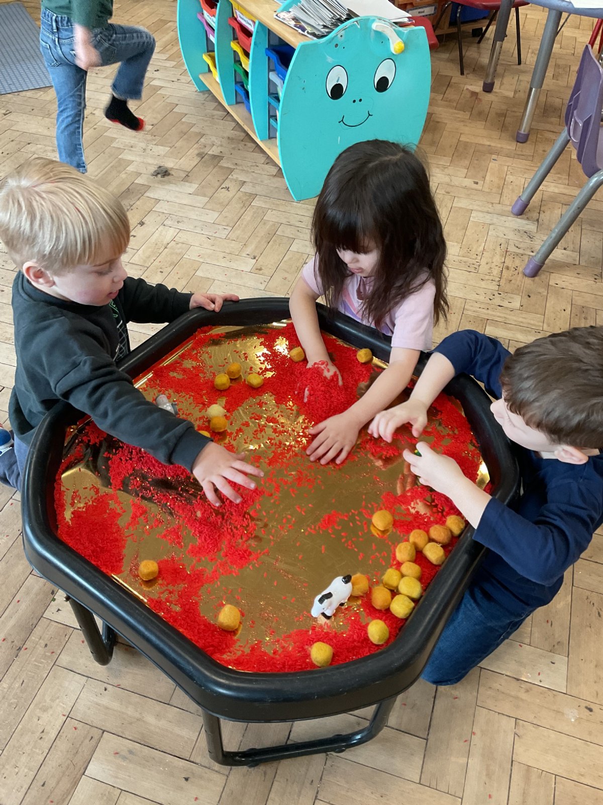 2026 is the year of the horse, we did a lovely activity threading wool through holes to make the horses mane. Using a large cardboard box, we decorated with red, orange and gold glitter to make a Chinese dragons head. We took it out of the field to do some Chinese dragon dancing. We had a Chinese themed sensory tuff tray with red rice, gold pom poms and we used our fingers to make patterns in the rice. We had a Chinese snack, trying spring rolls and prawn crackers. We talked about different foods and spices and where they come from.