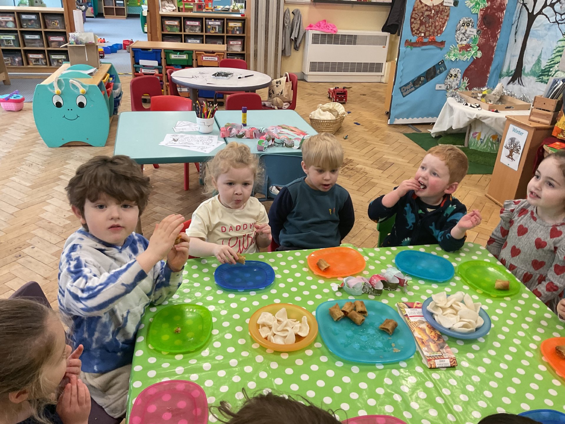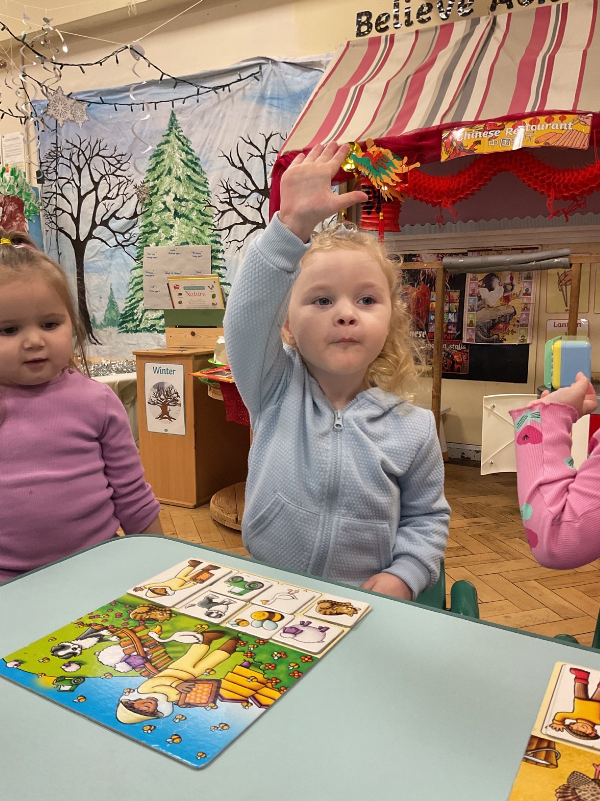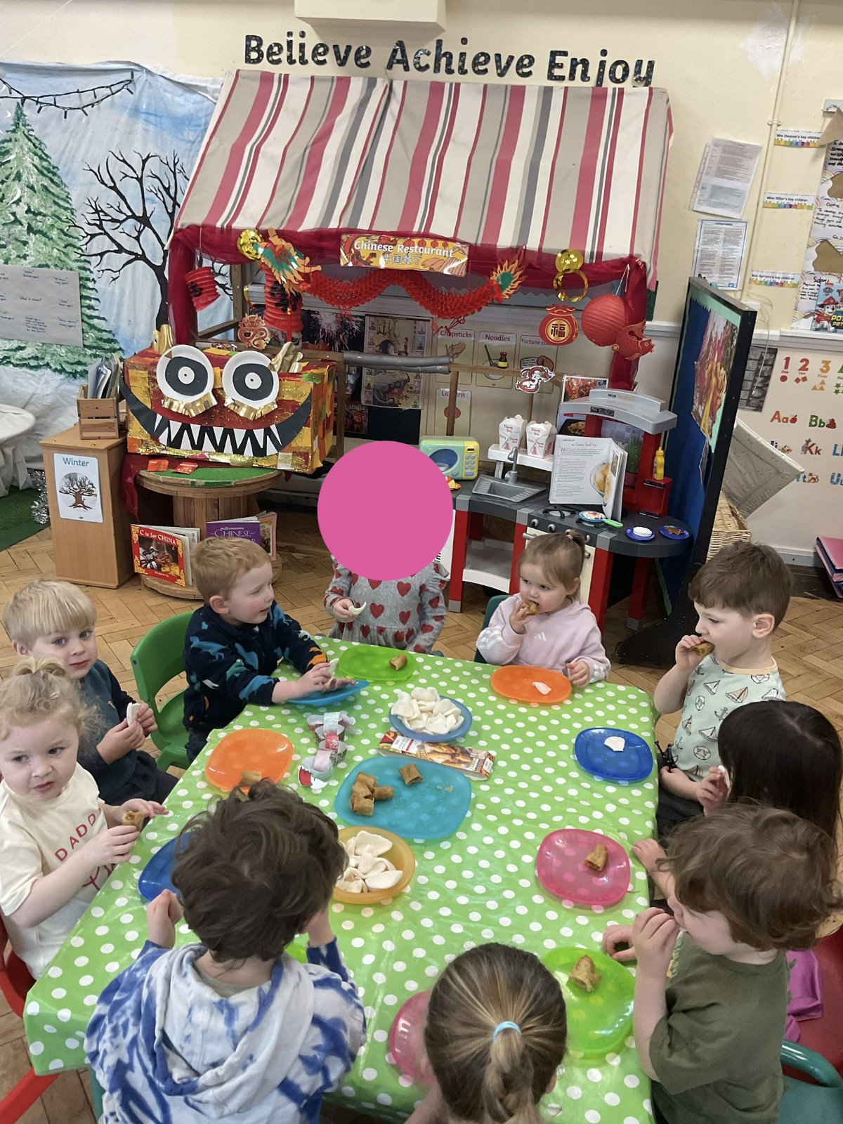 We had great fun outside on the school field finding lots of muddy puddles to jump in and chasing bubbles, trying to pop them! We also burnt up of a lot of energy climbing on the outdoor climbing apparatus. As February is the month of celebration we learnt all about the Chinese New Year where we had a Chinese restaurant role-play. We watched the BBC philharmonic orchestra programme on CBeebies about The Signs of the Zodiac listening to the songs and music.