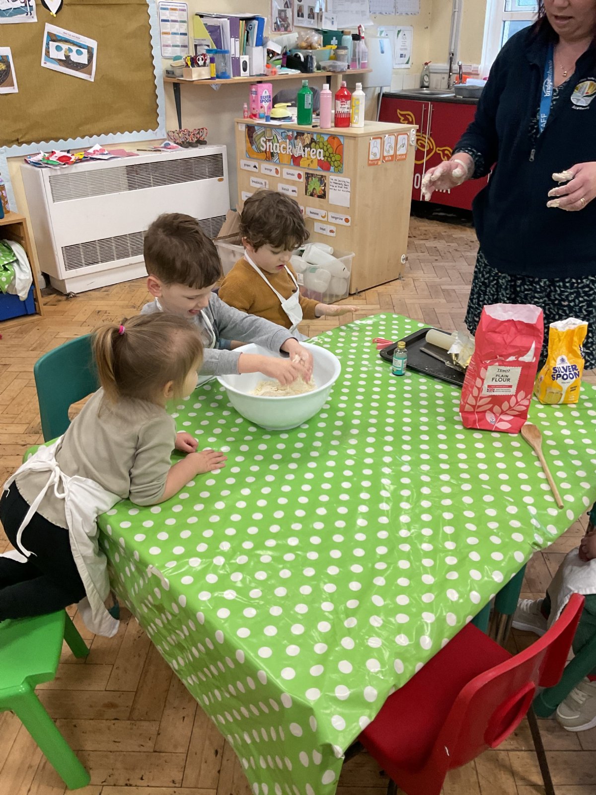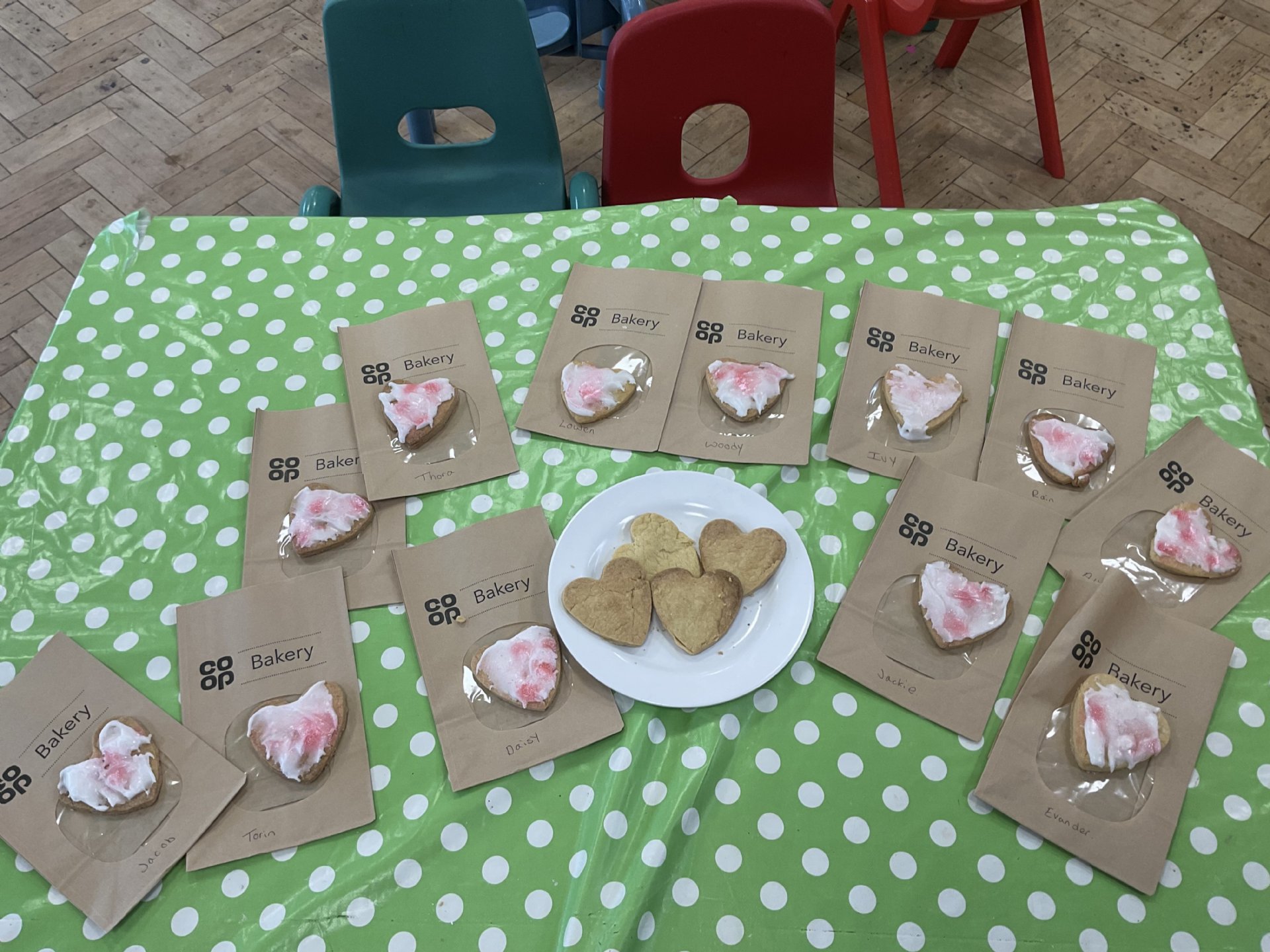 We made heart-shaped biscuits we learned what ingredients we needed to make our biscuits, when we mixed them together to make our dough. We did great spreading of the icing to decorate our biscuits.