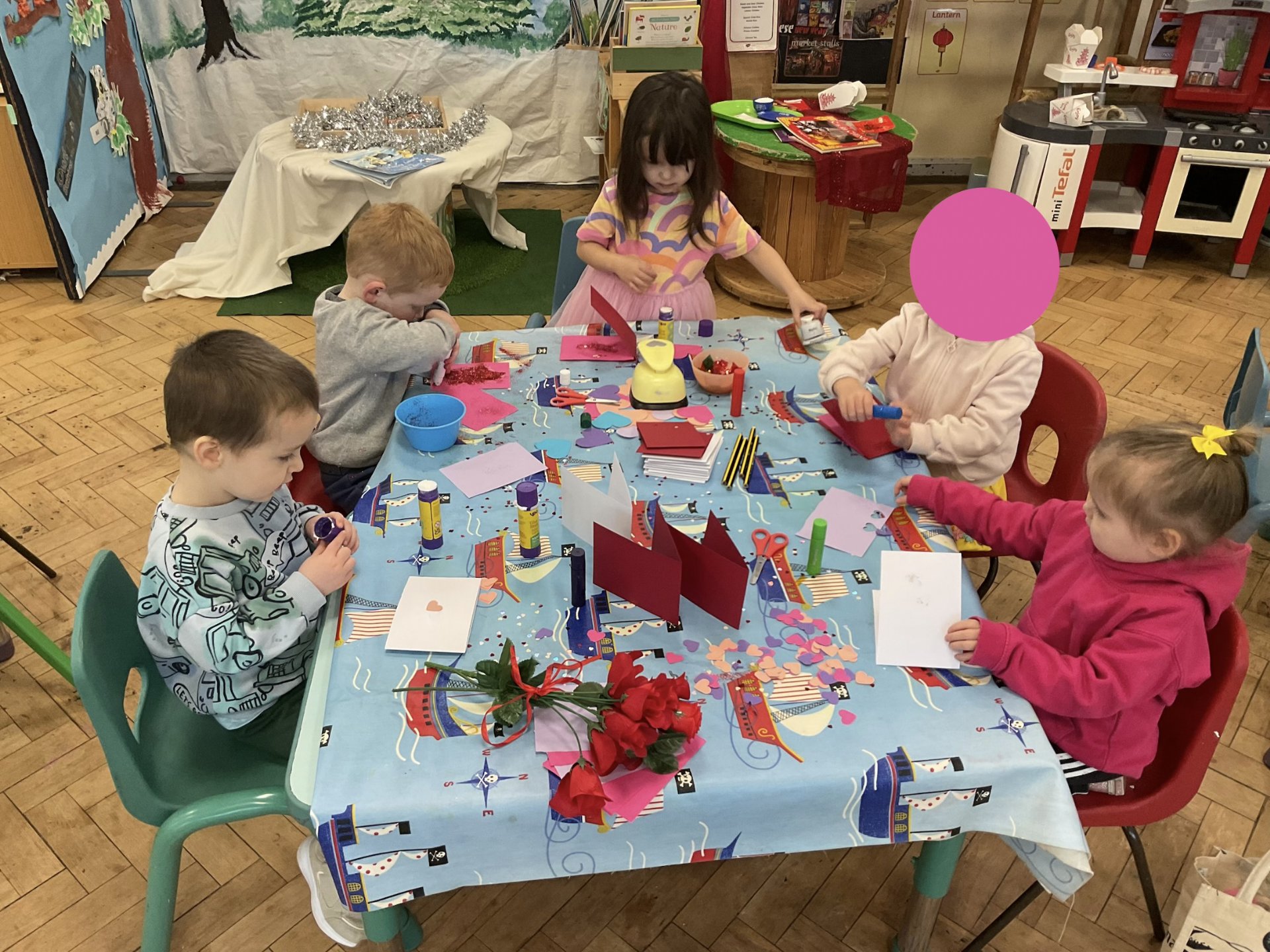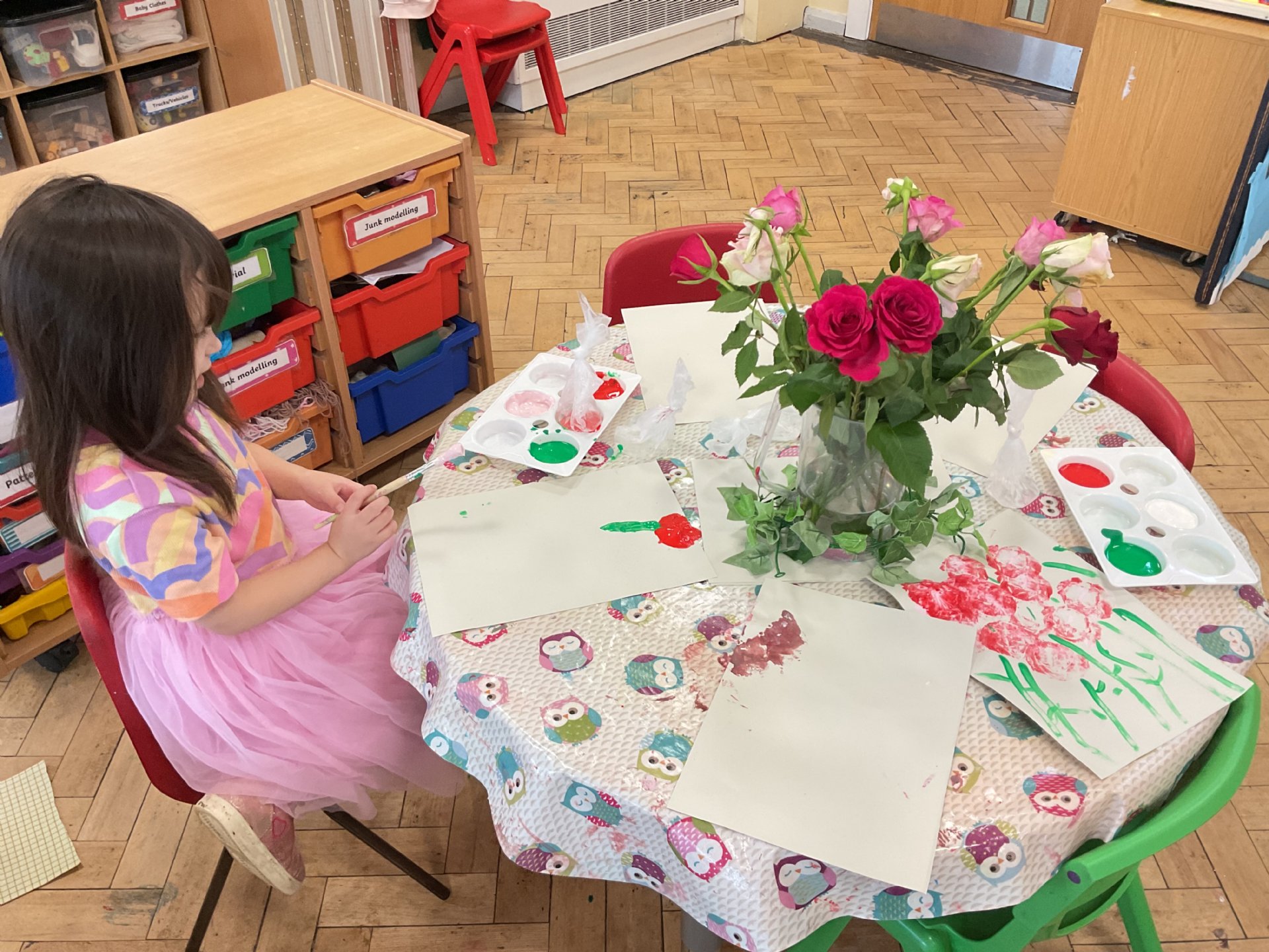 We have had a lot of love in nursery too during last week of term, leading up to Valentine's Day. We made valentine's cards and talked about who we love. We made a heart decoration using beads and pipe cleaners -this helped to build fine motor skills and the children showed amazing persistence- taking their time threading the beads, making their own colour patterns for their desired effect. They looked amazing. We had a display of roses for our still art. The children used plastic bags with water in them to get the pattern of a rose, using a paint brush for the stem.