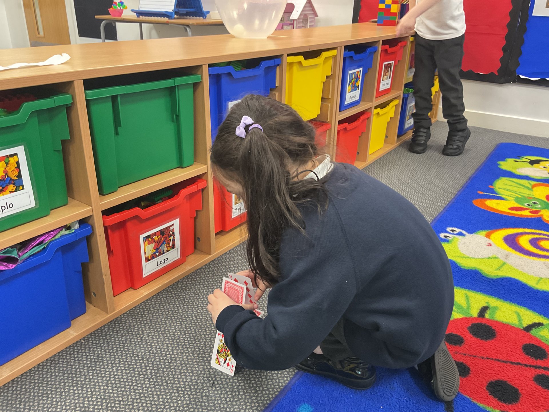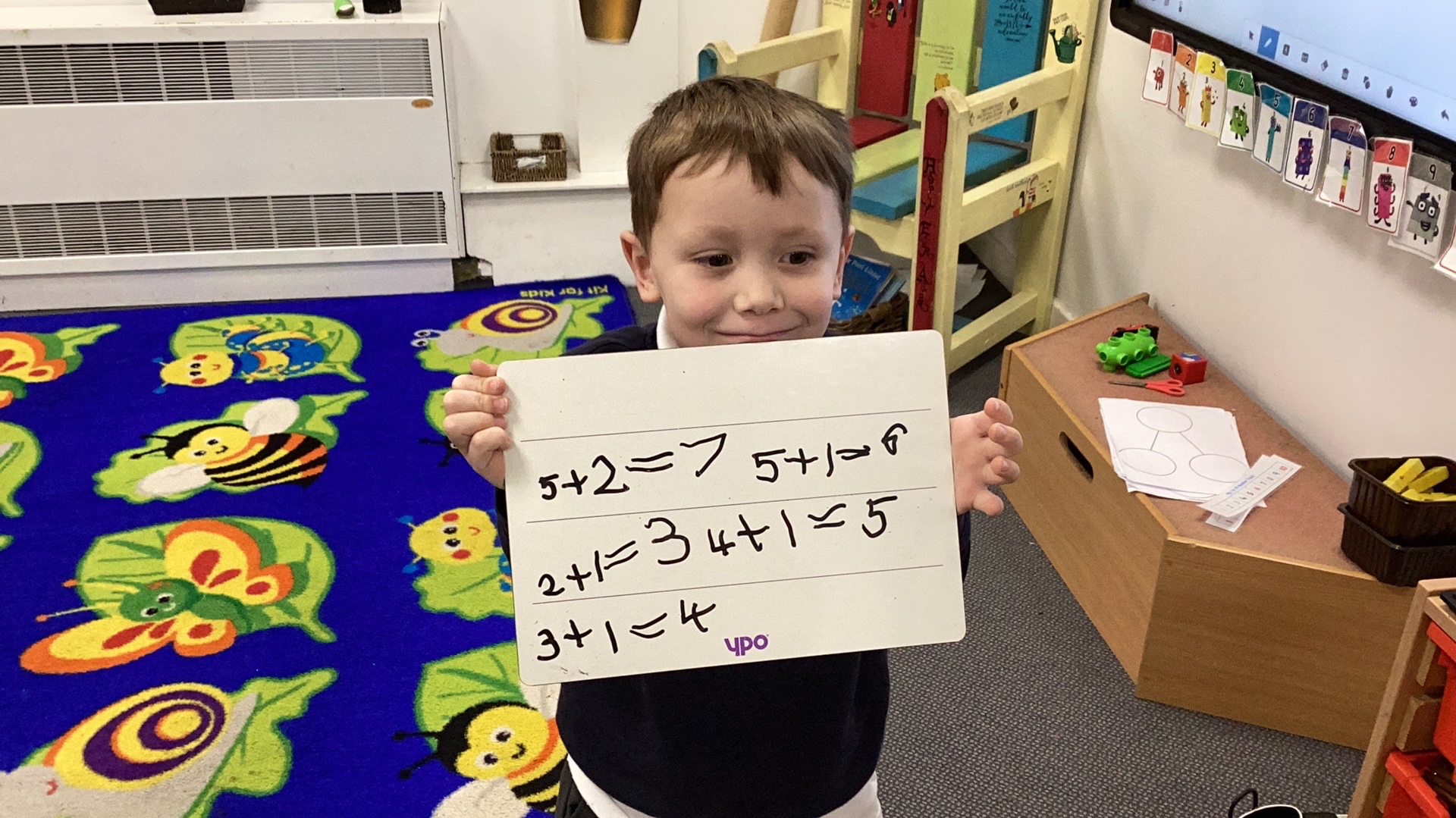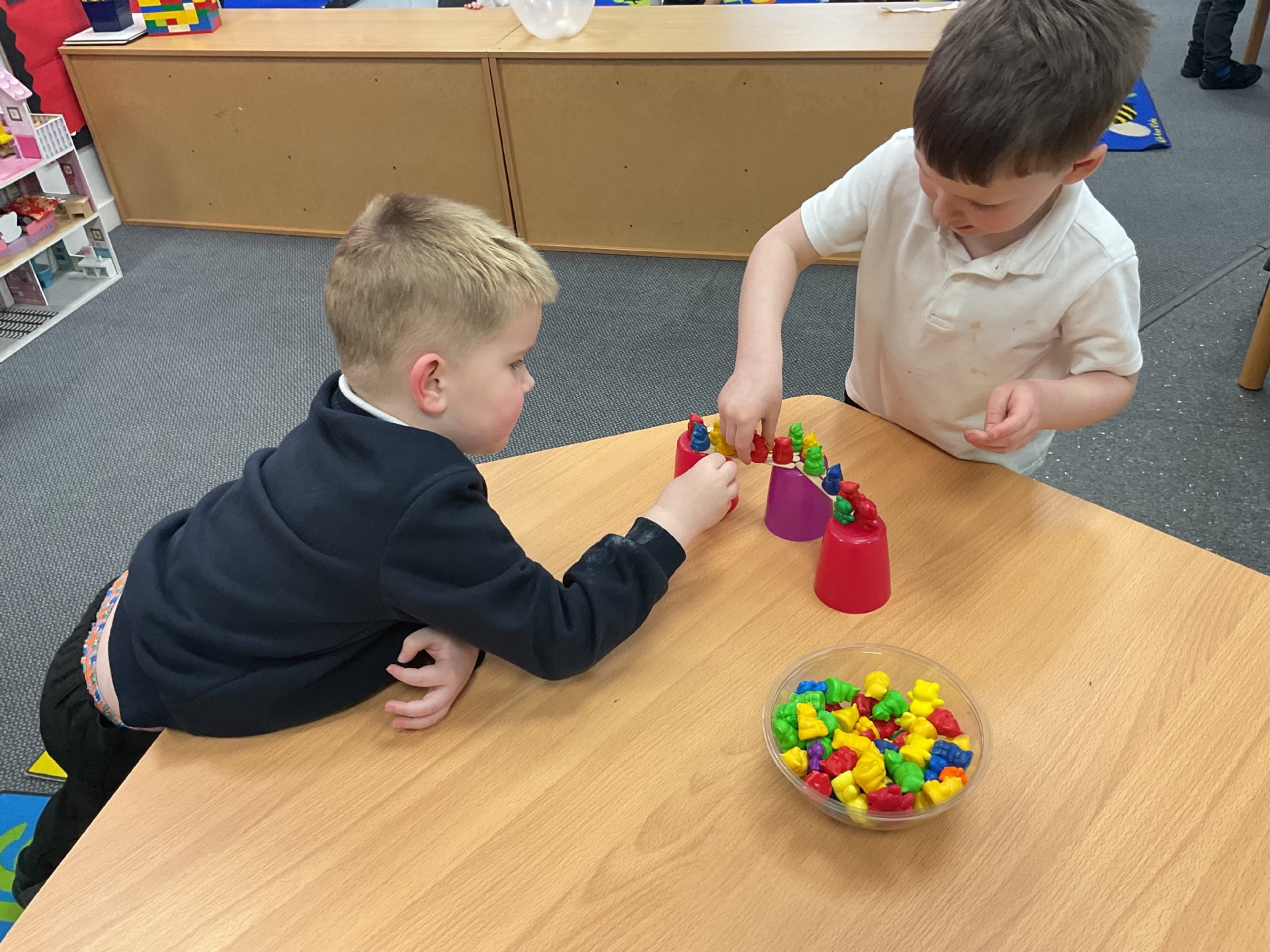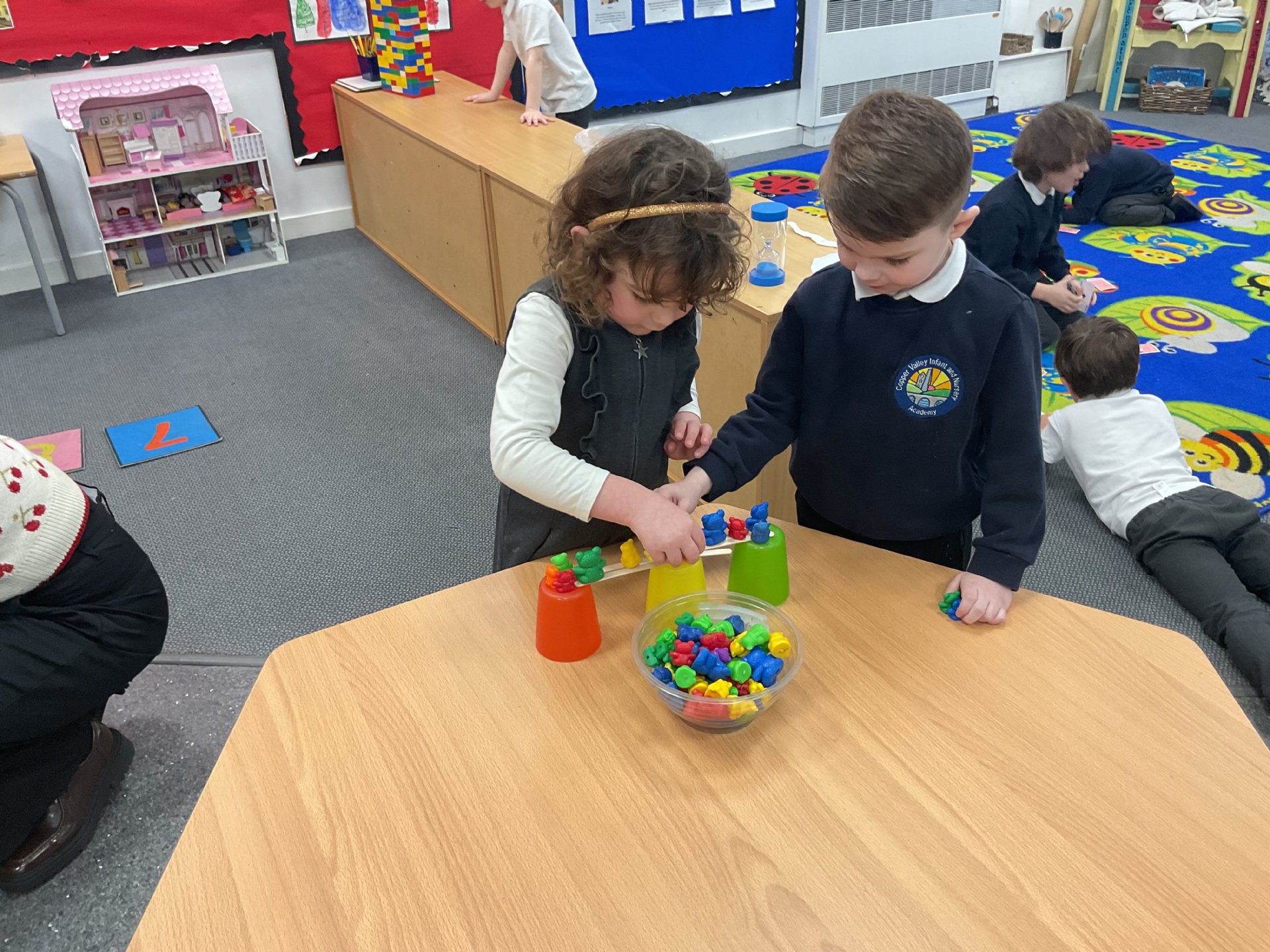 In maths we've been learning number bonds to 5. We've also been practising our counting skills every day. We've learnt to compare groups of objects and to say whether there are more, fewer or an equal amount.