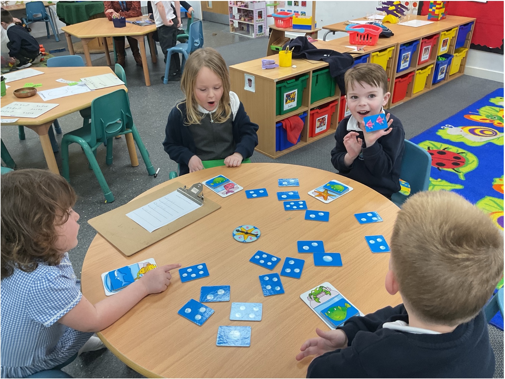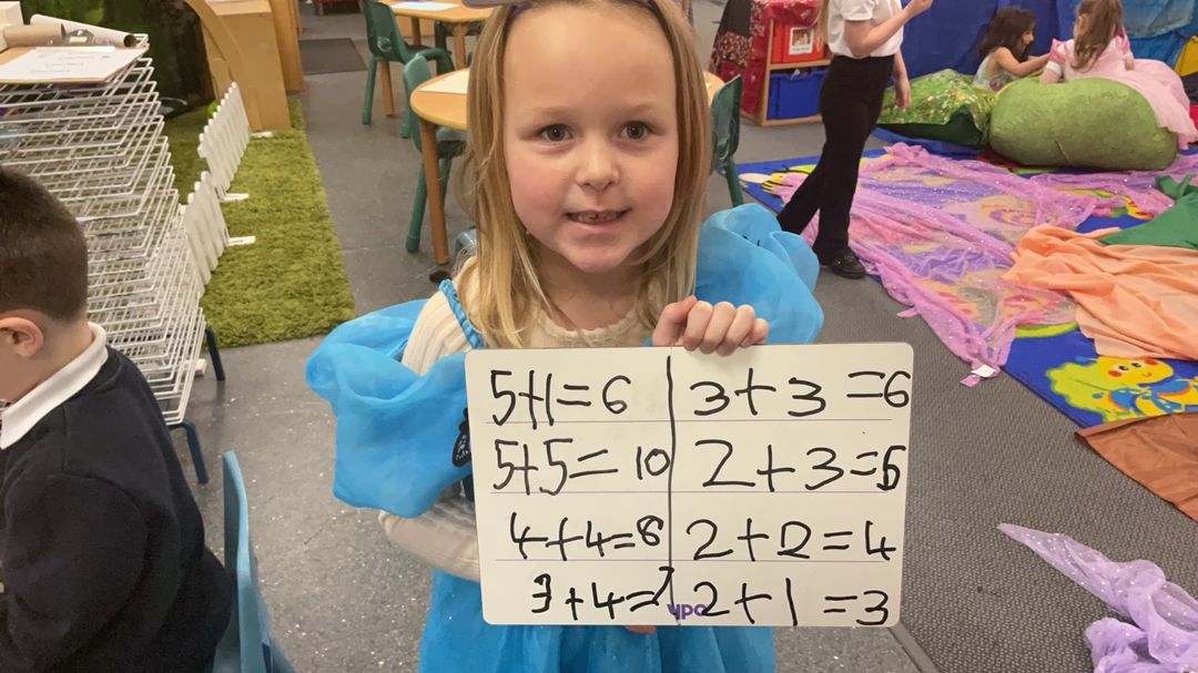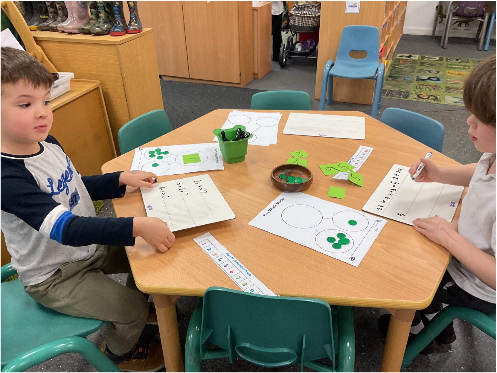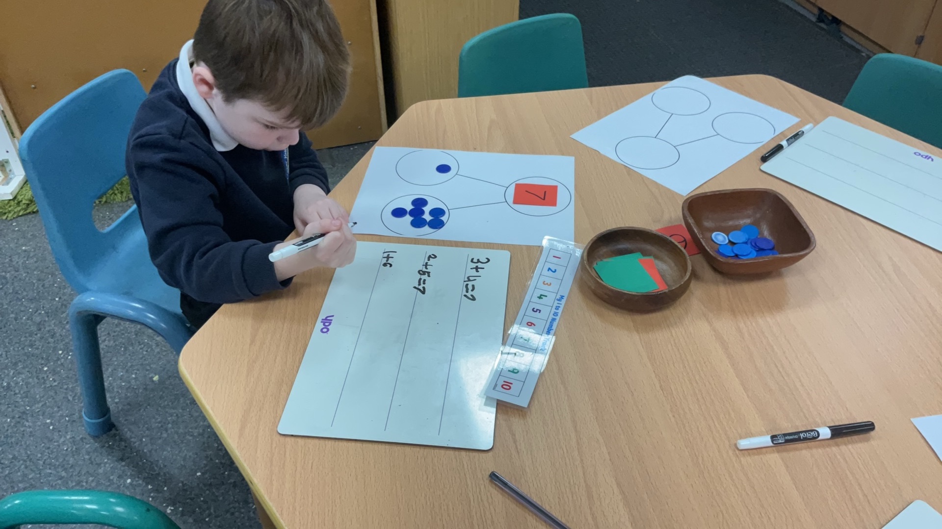In maths we've been learning number bonds to 5. We've also been practising our counting skills every day. We've learnt to compare groups of objects and to say whether there are more, fewer or an equal amount.