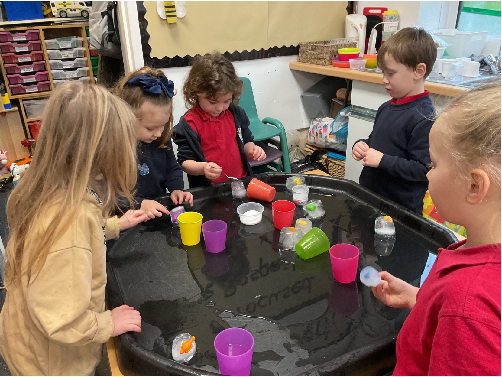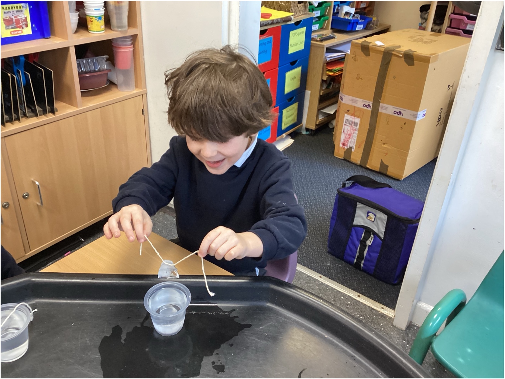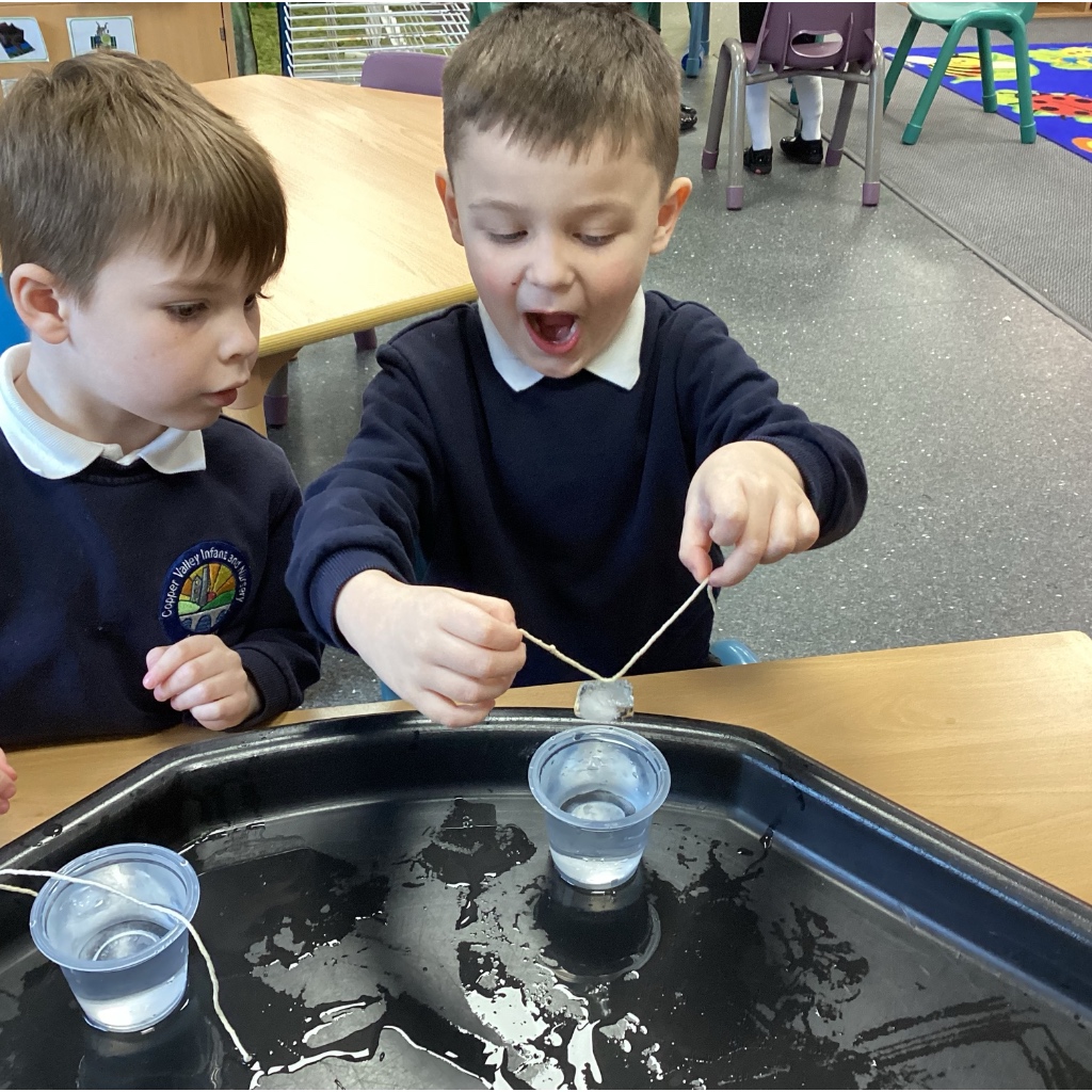 We've been learning about winter and the changes that occur. We started by looking at the trees and then moved onto talking about the weather with a particular focus on ice. We predicted what we thought would happen when we added cold water, hot water and salt to ice cubes. We then observed what happened and talked about whether our predictions were correct. We were challenged to see if we could pick up the ice cubes using string. We also investigated what happened when we painted the ice. We added salt and paint to see what happened. We also investigated how to get toys that were frozen in the ice out.