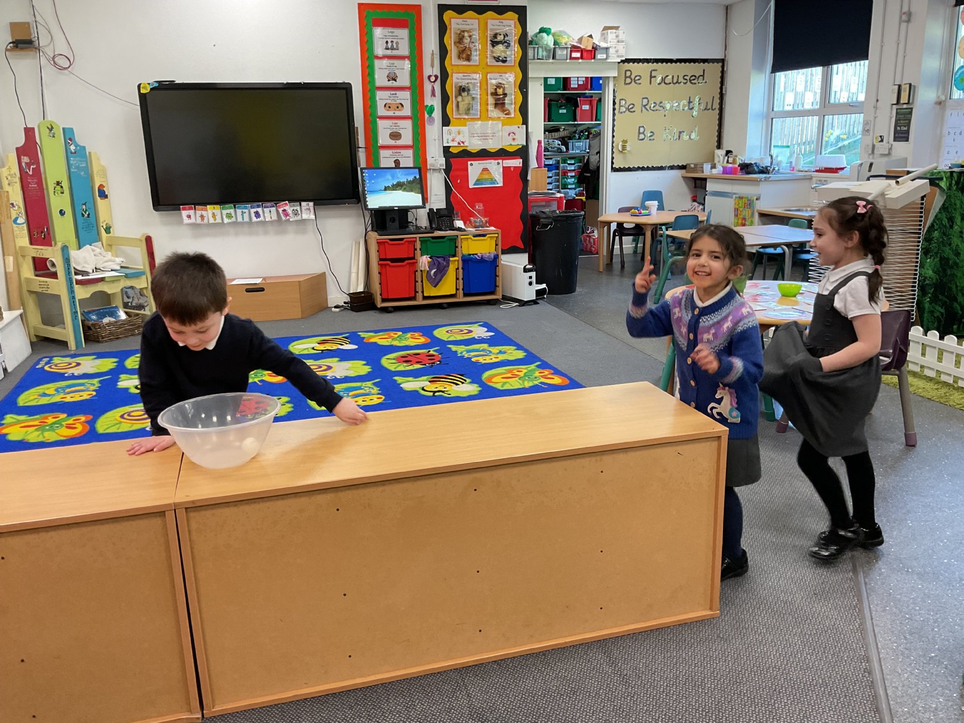 In maths we've been learning to recognise 2, 3 or 4 objects, pictures or sounds without needing to count them. We've also started to learn number bonds for 3 and 4. We've been investigating different ways of making these numbers using fingers, beads and objects. In addition to this we've also been learning about capacity.